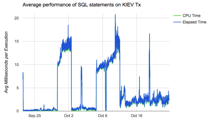 Chart below depicts a typical case where the average performance of a large set of business-critical SQL statements suddenly degraded from sub-millisecond to 15 or 20ms, then beccome more stable around 3ms. Wide spikes are a typical trademark of an Execution Plan for one or more SQL statements flipping for some time. In order to produce a more consistent latency we needed to improve plan stability, and of course the preferred tool to achieve that on an Oracle database is SQL Plan Management.