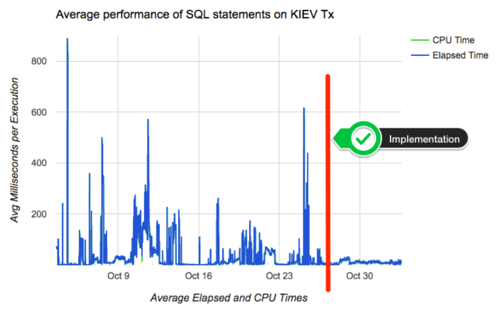 Chart below shows how average performance of business-critical SQL became more stable after implementing algorithm to adapt and adopt SPM on a pilot PDB. Not all went fine although: we had some outliers that required some tuning to the algorithm. Among challenges we faced: volatile data (creating a SPB when table was almost empty, then using it when table was larger); skewed values (create a SPB for non-popular value, then using it on a popular value); proper use of multiple optimal plans due to Adaptive Cursor Sharing (ACS); rejected candidates due to conservative initial restrictions on algorithm (performance per execution, number of executions, age of cursor, etc.)