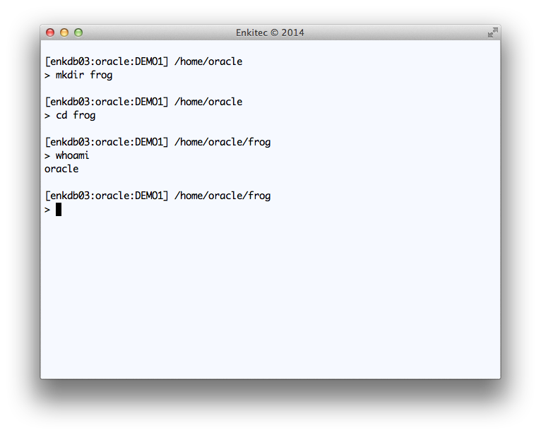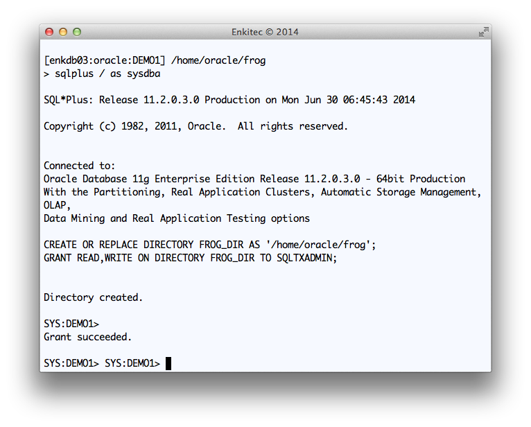 To implement Public API SQLTXADMIN.SQLT$E.XTRACT_SQL_PUT_FILES_IN_DIR on your tool, you need first to create and test a staging directory where the API will write files. This directory needs to be accessible to the “oracle” account, so I show below how to create sample directory “frog” while connected to the OS as “oracle”.