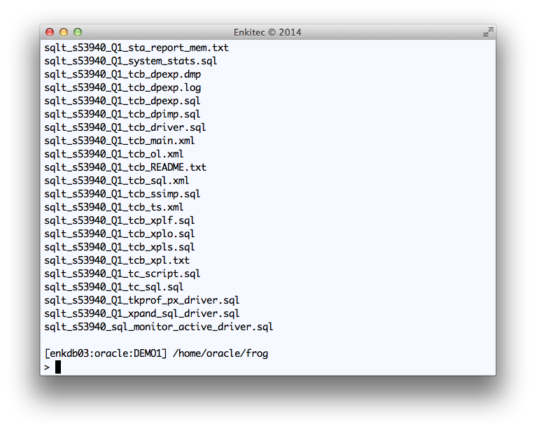 I used “Q1” as a tag to be included in all output files. And I used staging directory “FROG_DIR” at the database layer, which points to “/home/oracle/frog” at the OS layer.