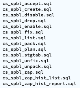 Current version of the CS scripts is more like a toolset. You treat them as a whole. All of them call some other script that exists within the cs_internal subdirectory, then I usually navigate to the parent sql directory, and connect into SQL*Plus from there. All these scripts can be easily cloned and/or customized to your specific needs. They are available as “free to use” and “as is”. There is no requirement to keep their heading intact, so you can reverse-engineer them and make them your own if you want. Just keep in mind that I maintain, enhance, and extend this CS toolset every single day; so what you get today is a subset of what you will get tomorrow. If you think an enhancement you need (or a fix) is beneficial to the larger community (and to you), please let me know.