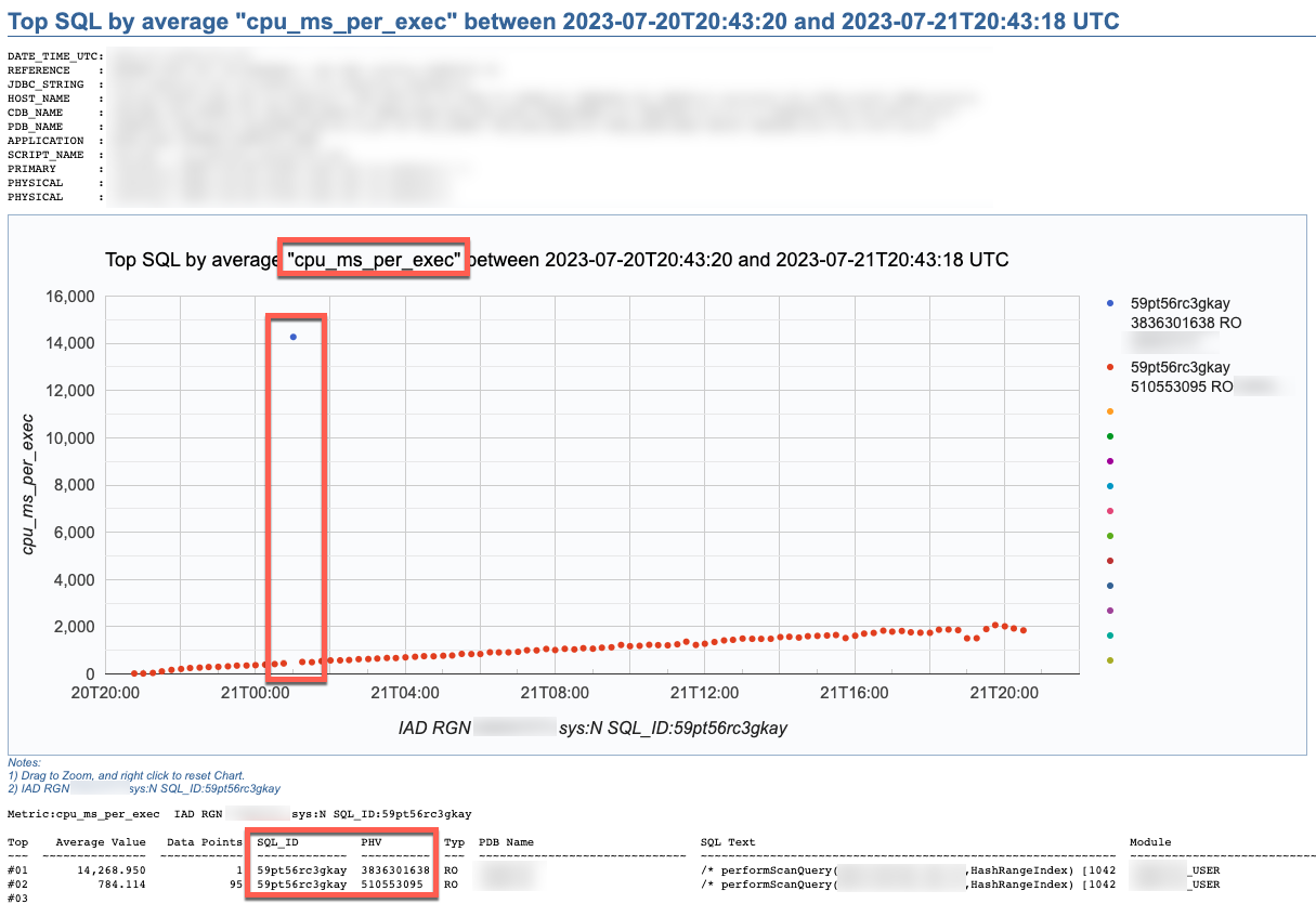 SQL Stats Analytics reads mainly DBA_HIST_SQLSTAT, performs some aggregations to compute multiple SQL statistics, selects the “top” SQL_ID/PLAN_HASH_VALUE pairs as per one selected Statistic, and produces some free Google chart, writing it into a text file to your local SQL*Plus directory where you started SQL*Plus (either on your Term client such as Mac/PC, or your DB server). The generated text file contains plain html, thus it can be opened using any browser. The chart allows some useful zooming on it.